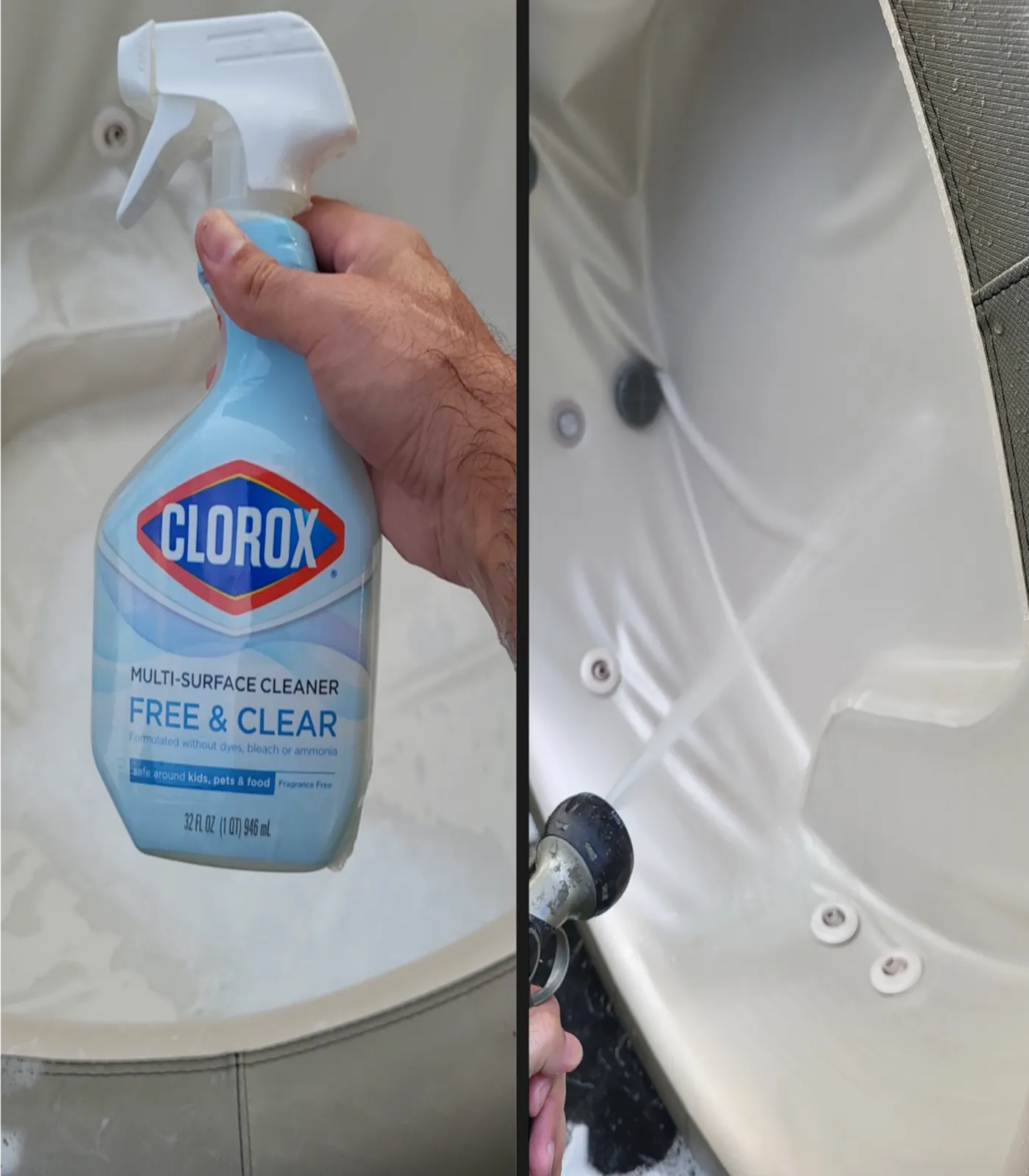 In our fourth cleaning stage, we ensure no soap or water is left behind by thoroughly rinsing the tub. After ensuring it's completely dry, the exterior is treated with Clorox disinfectant, sealing in the cleanliness and providing peace of mind.