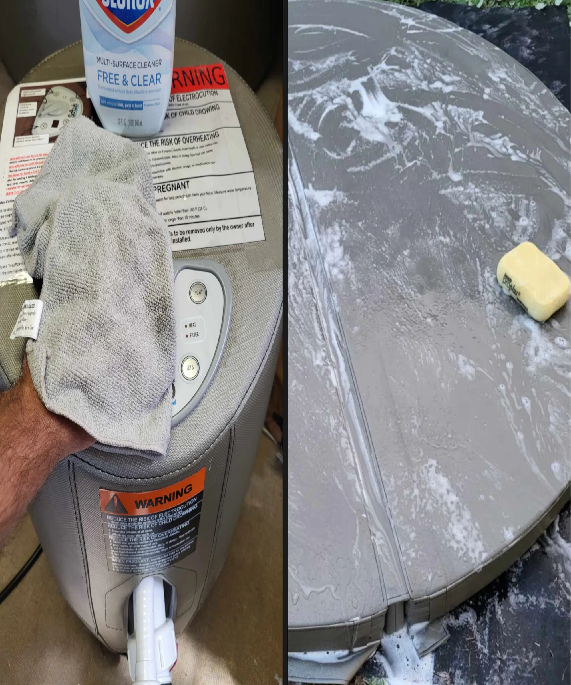 Lastly, we finalize our cleaning process with some finishing touches. Scrubbing down the spa lid with soap and spraying down the controls with a disinfectant.